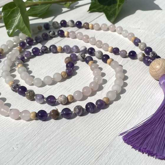 Liebe und Spirituelle WeisheitTauchen Sie ein in ein Universum von Sanftheit und Weisheit mit diesem Mala aus 108 Perlen aus Rosenquarz und Amethyst, das entworfen wurde, um Liebe, inneren Frieden und spirituelle Weisheit in Ihren Alltag zu bringen. Der Rosenquarz, mit seinem zarten Farbton, ist der Stein der bedingungslosen Liebe, während der Amethyst, mit seinen tiefvioletten Nuancen, für seine kraftvollen spirituellen Eigenschaften bekannt ist.