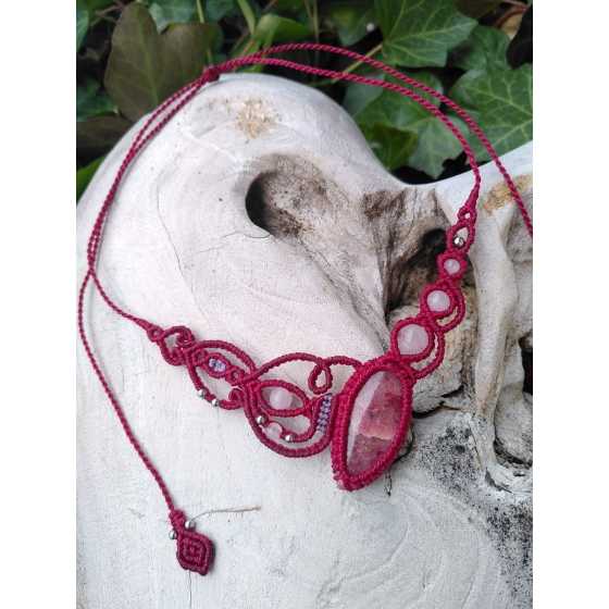 45,00 CHFHandgefertigte Halskette aus Mikromakramee, Rhodonit und Perlen aus rosa Quarz