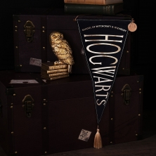 Das dreieckige Banner aus schwarzem Stoff hat eine goldene Umrandung und ist mit dem goldenen Aufdruck "Hogwarts", einer goldenen Quaste und dem "Hogwarts-Stempel" verziert. Es ist für die Wandaufhängung mit dem angebrachten goldenen Fadenaufhänger gedacht.