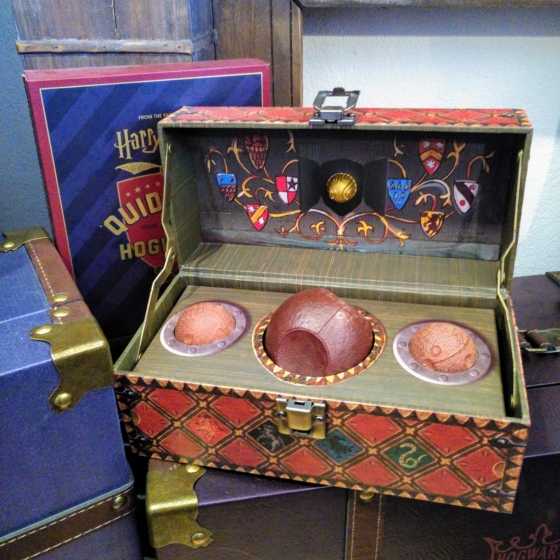 Hier ist das erste offiziell lizenzierte Harry Potter "Collectible Quidditch Set", das Folgendes enthält: 2 Quaffles, 1 Bludger, 1 Bat, einen Quidditch-Koffer (wie die Verpackung des Sets) und ein 16-seitiges Buch mit 8 vollfarbigen Aufklebern.