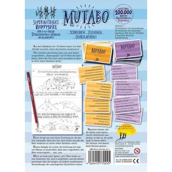 Zeichne, was du liest - beschreibe, was du siehst! Spass haben, kreativ sein, supergute Stimmung verbreiten - mit MUTABO ist das alles kein Problem. Das Herzstück dieses Spiels sind die 110 Spielkarten mit witzigen Satzanfängen und albernen Satzenden. Damit sind über 100.000 lustige Geschichten kombinierbar: Satz schreiben, der nächste Spieler zeichnet, faltet den Satz weg, der wiederum nächste Spieler schreibt, was er sieht und faltet die Zeichnung weg usw. Am Ende darf gelacht werden, was Ende dabei herausgekommen ist.