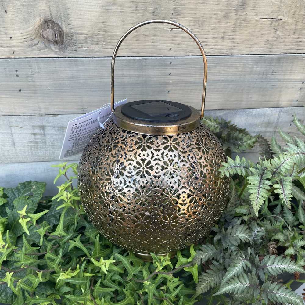 Inspiriert von Aladins Wunderlampe schafft diese runde solarbetriebene LED-Lampe aus bronzefarbenem Metall 1001 leuchtende Ornamente. Dank des Dämmerungssensors ändert die Solarlampe wie von Zauberhand ihre Helligkeit und sorgt so immer für die perfekte Stimmung. Dank des Henkels lässt sich die Leuchte leicht tragen und kann vielseitig eingesetzt werden.