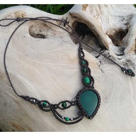 Handgefertigte Halskette aus Mikromakramee, Malachit-Cabochon und Perlen aus Malachit-Imitat.