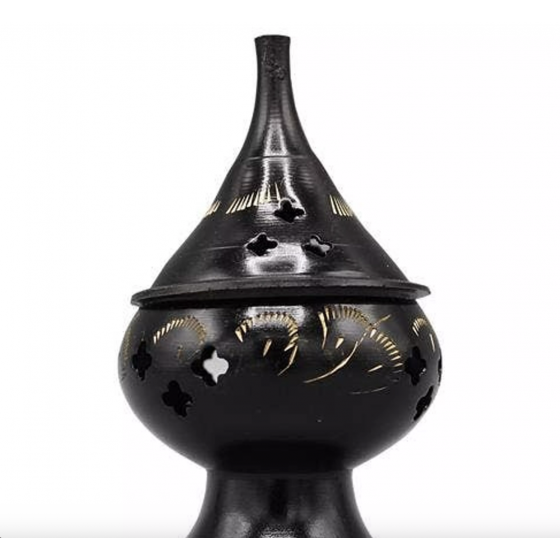 Porte-encens suspendu en métal noir, décoré de motifs dorés. Idéal pour brûler en toute sécurité grains d'encens, résines et cônes, avec une diffusion douce et enveloppante. Un accessoire pratique et esthétique pour vos rituels, espaces sacrés ou moments de relaxation.