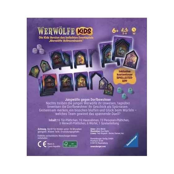18,00 CHFEndlich ist es so weit: die wilden Jungwölfe dürfen nachts ins Dorf losziehen, ihr Unwesen treiben und sich schlafende Dorfbewohner schnappen. Doch auch diese sind äußerst wehrhaft und planen gemeinsam, wie sie die Jungwölfe tagsüber in ihren Verstecken aufspüren können. Bei dieser Einstiegsversion des Werwölfe-Spiels treten die beiden Teams Werwölfe und Dorfbewohner gegeneinander an. Wer versteckt sich in welchem Haus? Wo sind die gefährlichen Werwölfe?Dieses Werwölfe-Spiel für Kinder kann ganz ohne oder mit der dazugehörigen, kostenlosen App gespielt werden. Es wird kein/e Moderator*in benötigt. Die Kinder können sofort losspielen. Die App sorgt für besonders kribbelige Atmosphäre und setzt die Kinder unter Zeitdruck, indem sie die Tag/Nacht-Phasen ansagt.