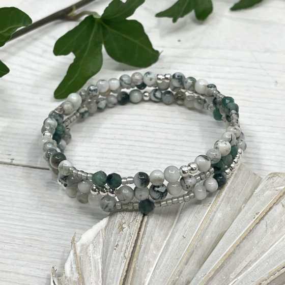 35,00 CHFBracelet triple en pierres naturelles : agate mousse, émeraude facettée, argent 925. Un bijou alliant apaisement, vitalité et harmonie. Taille unique.