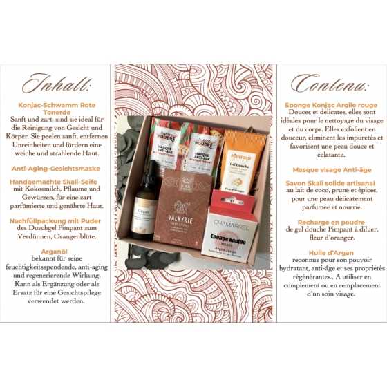 Box découverte spéciale peaux matures comprenant une éponge konjac, une huile d'argan, un savon du Skali, un masque et une poudre de douche Pimpant à diluer.