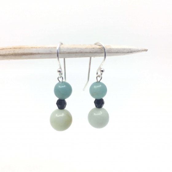 Boucles d'oreilles avec perles en Amazonite (6 et 8 mm) et perles Swarovski noires (4mm). Apprêts en argent sterling 925, assemblé à la main.
