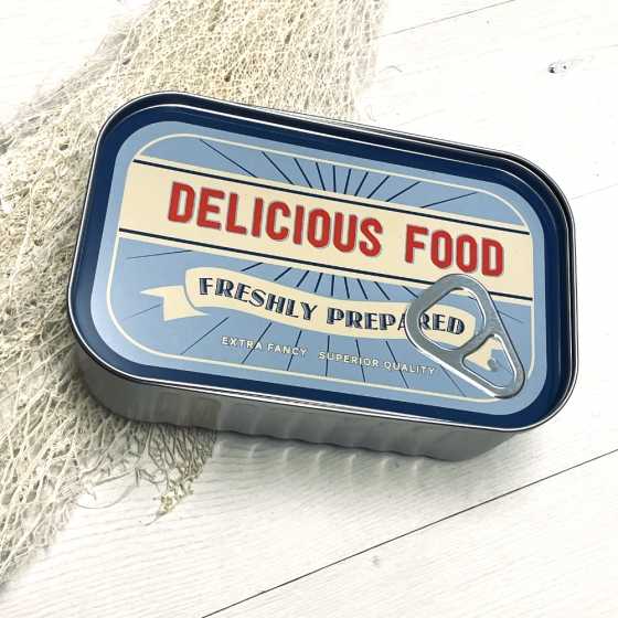 La boîte avec l'impression Delicious Food mesure 21 x 13 x 7 centimètres. Ne va pas au lave-vaisselle.