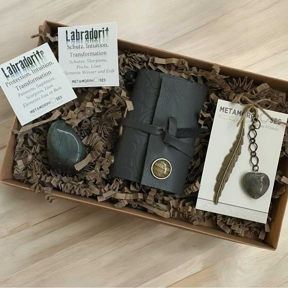 Set cadeau comprenant un petit carnet de voyage artisanal en cuir de couleur grise avec pendentif en labradorite, une pierre de labradorite et un marque page en métal avec pendentif en labradorite.