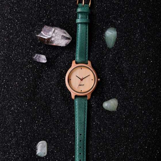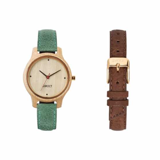 Ø 34 mm - Boitier en bois - Bracelets cuir grainé couleur émeraude et brun