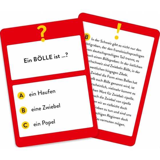 Das unterhaltsame Quiz-Kartenspiel deckt die Geheimnisse der Schweizer Dialekte aus allen deutschsprachigen Kantonen auf: Was macht das Auto, wenn es sich trüllt? Und was bedeutet »eis go hebe«? Auf den Rückseiten der Karten gibt es neben der Lösung auch interessanten Fakten zu Herkunft und Verwendung des Begriffs zu entdecken. Das lustige Dialekt-Quiz für die ganze Familie ist ein tolles Reise-Spiel für den Urlaub in der Schweiz oder ein originelles Geschenk für Neu-Schweizer. Für Rate-Spaß ist bei jedem Spieleabend gesorgt.